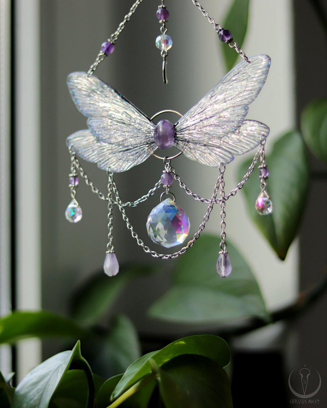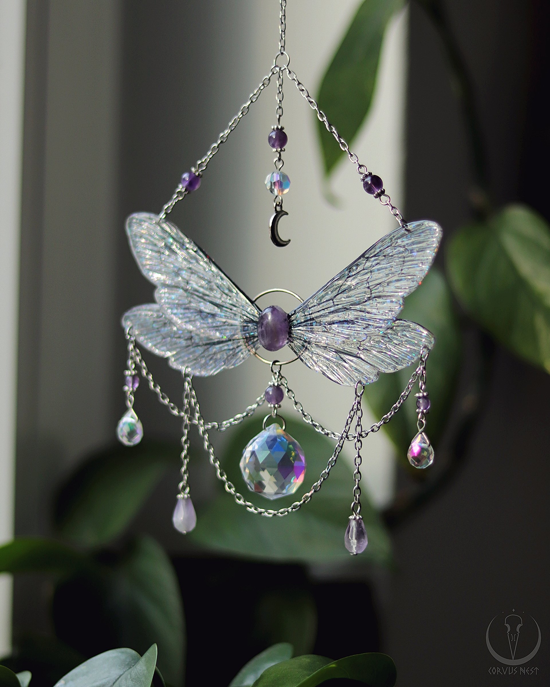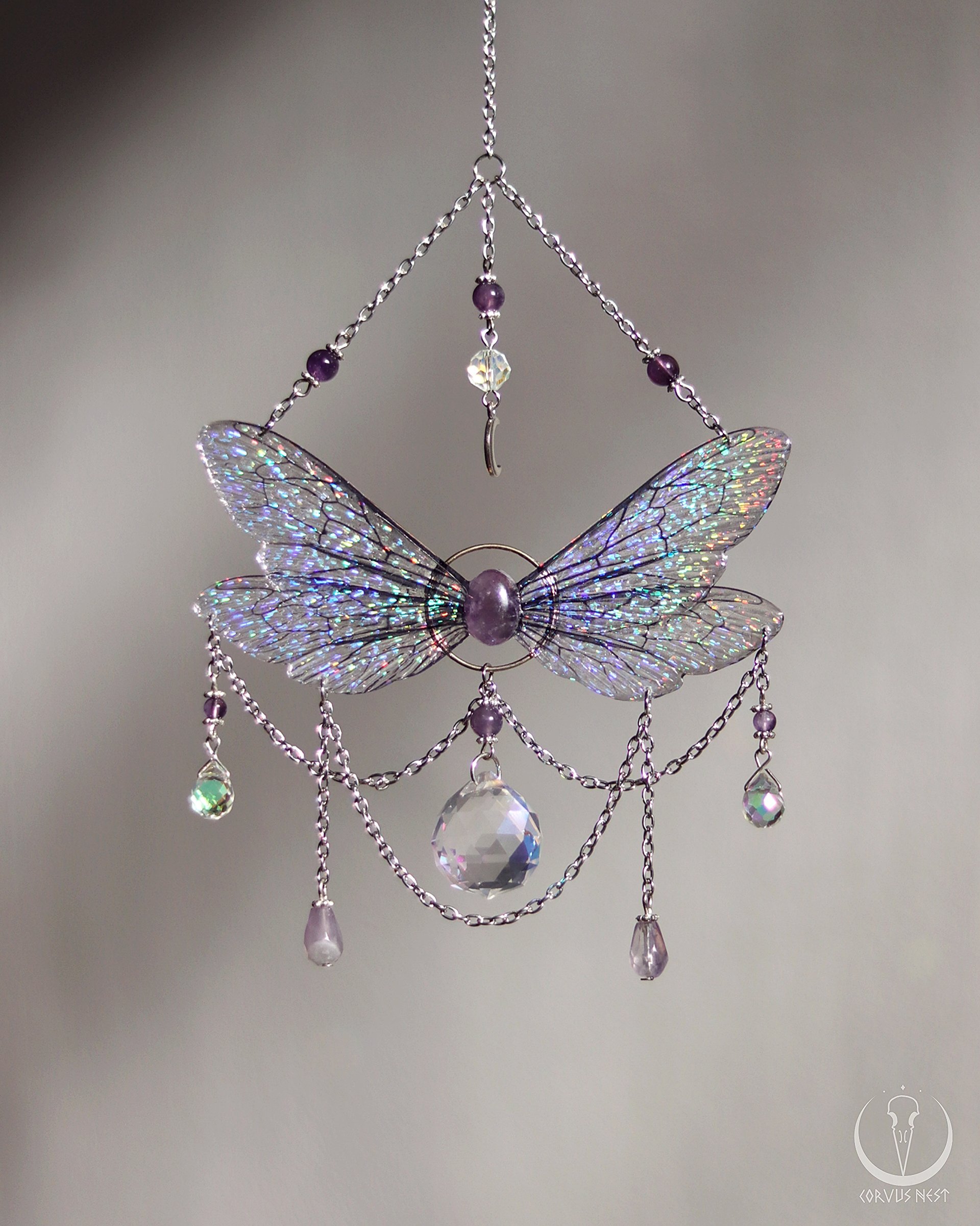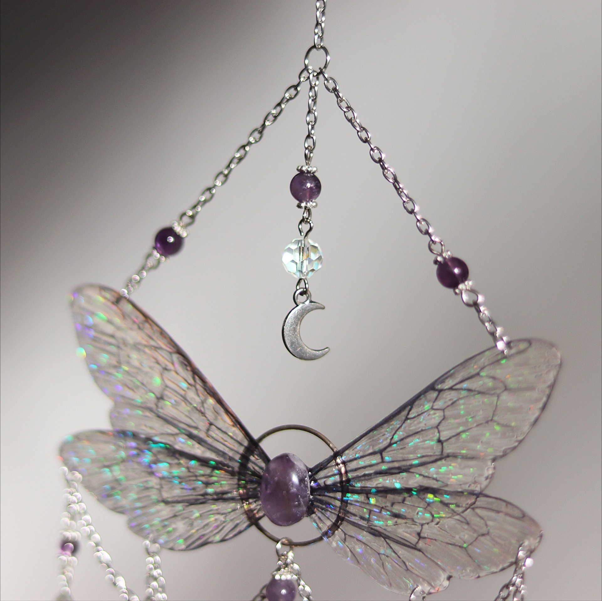 This magical fairy suncatcher consists of a double pair of holographic bee wings handmade out of resin, connected with an amethyst cabochon in its middle, a glass prism pendant, a little moon charm and several amethyst and glass beads, hanging on silver plated chain with a hook on its end.