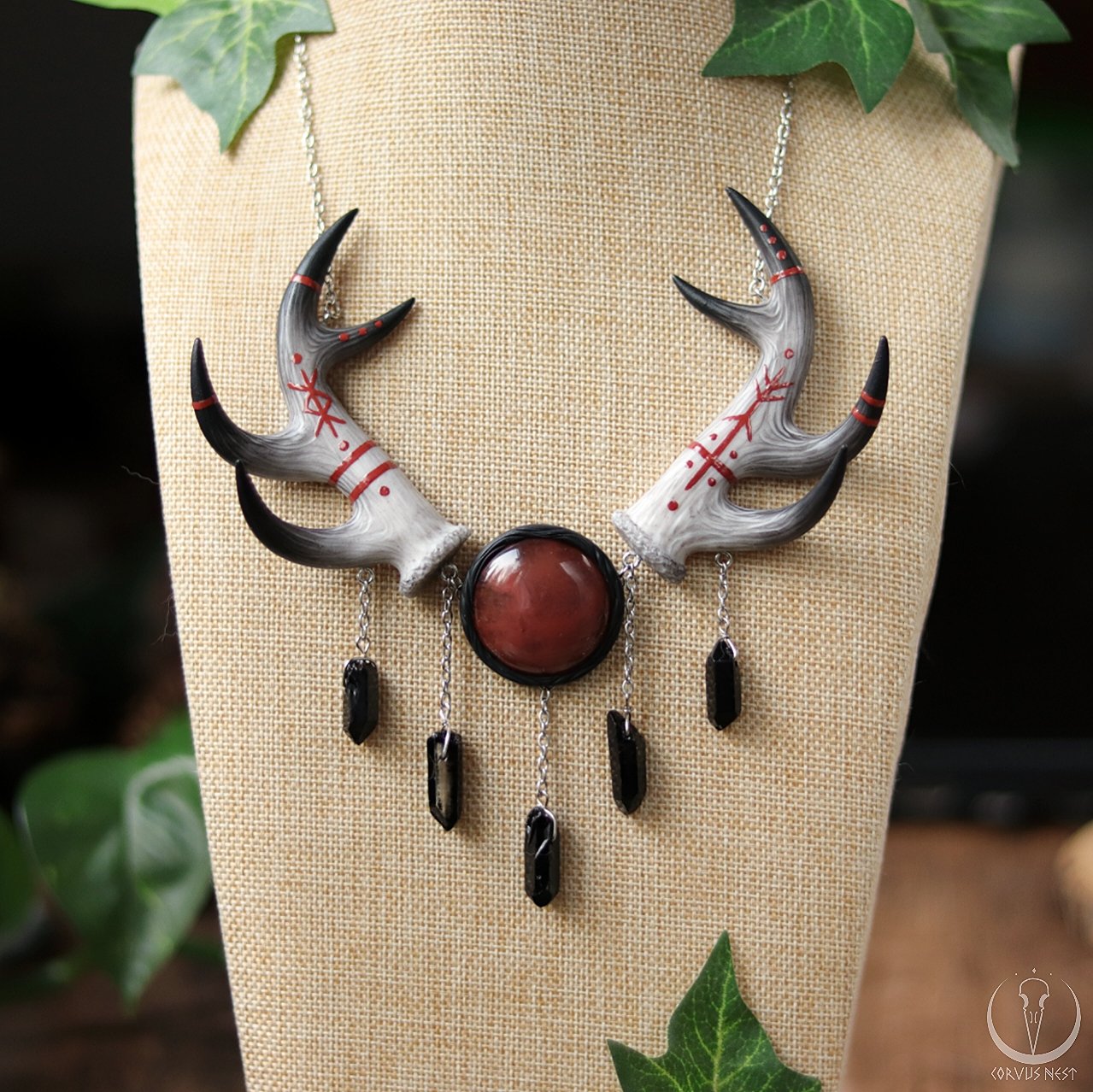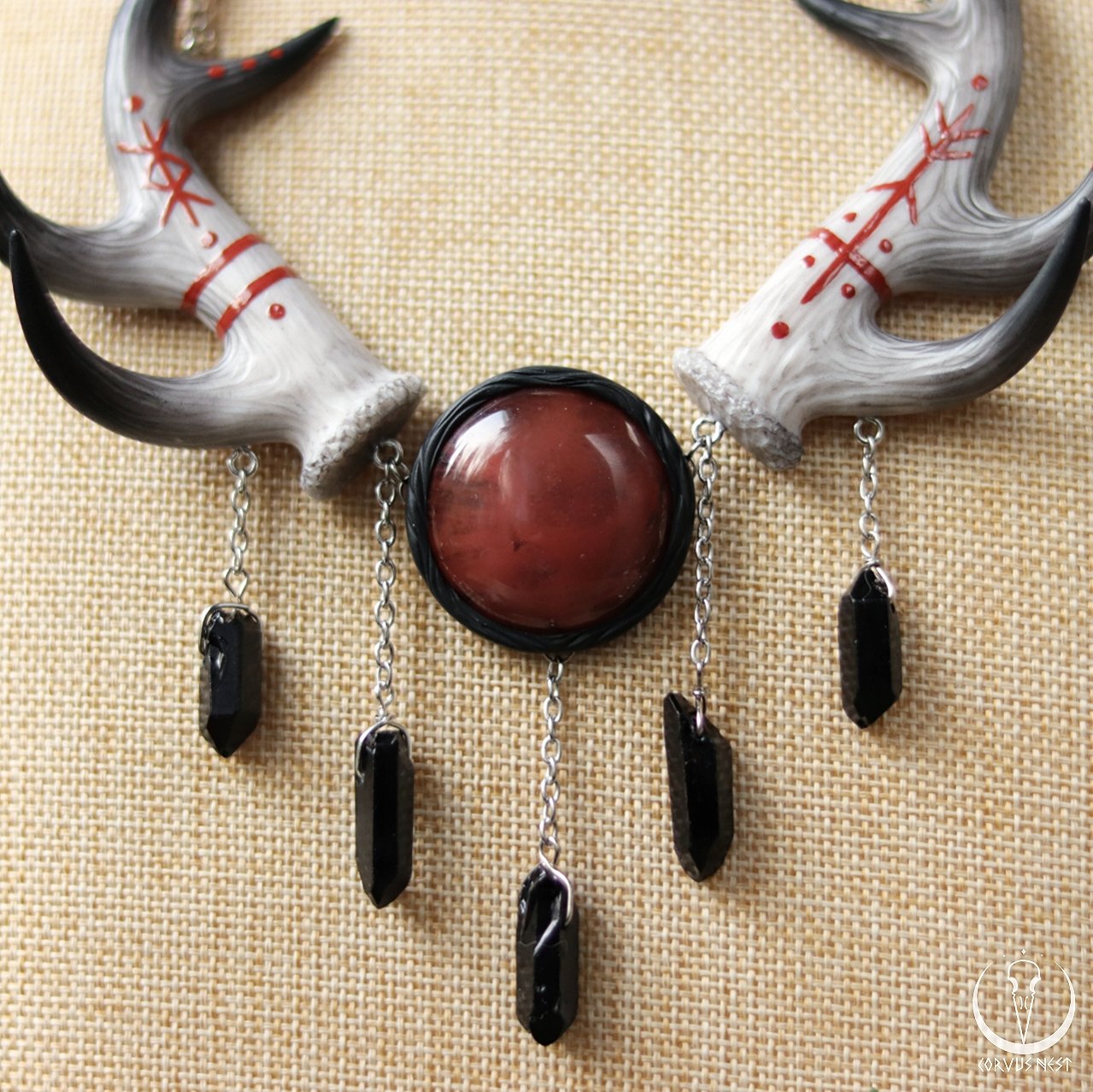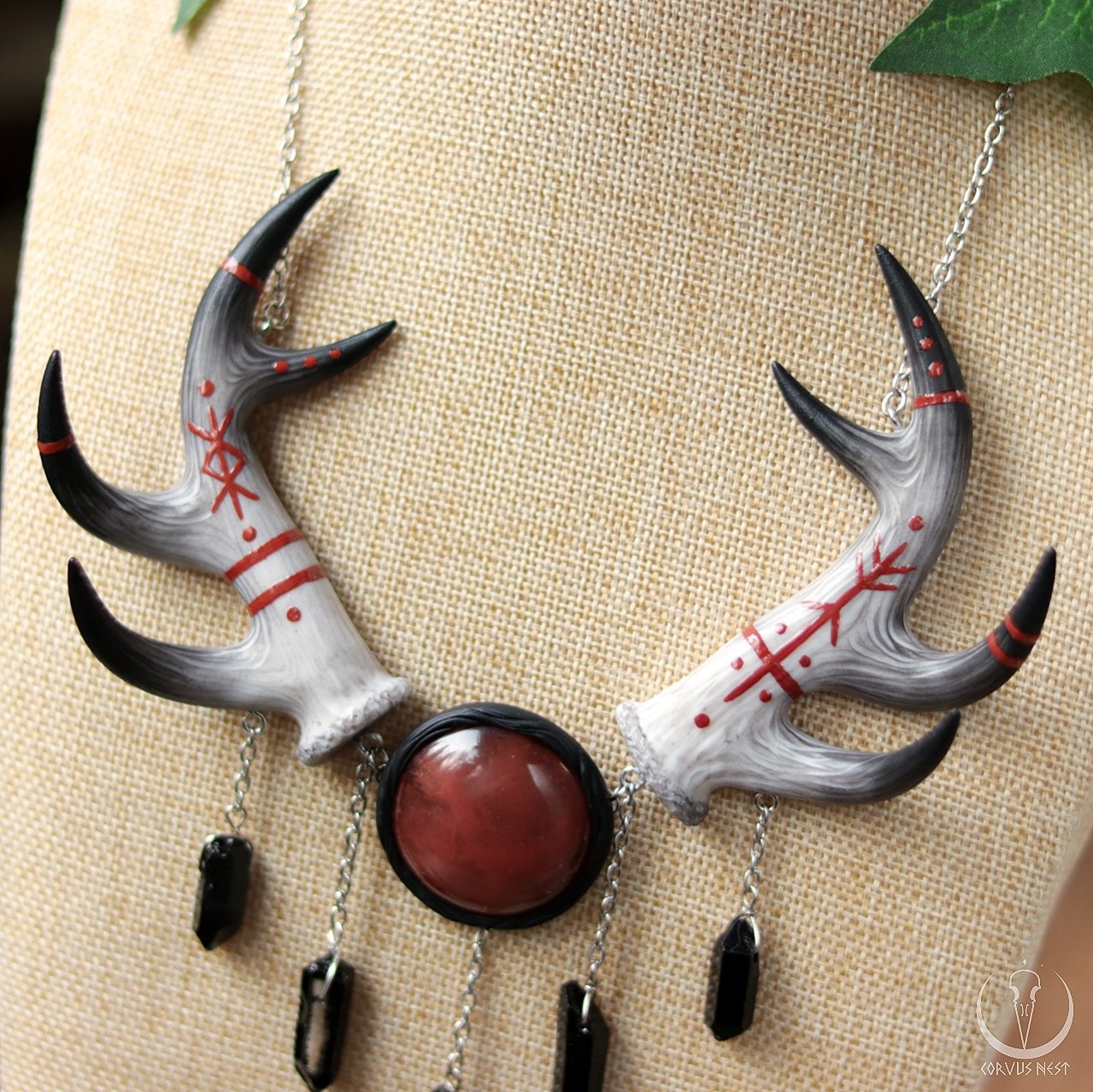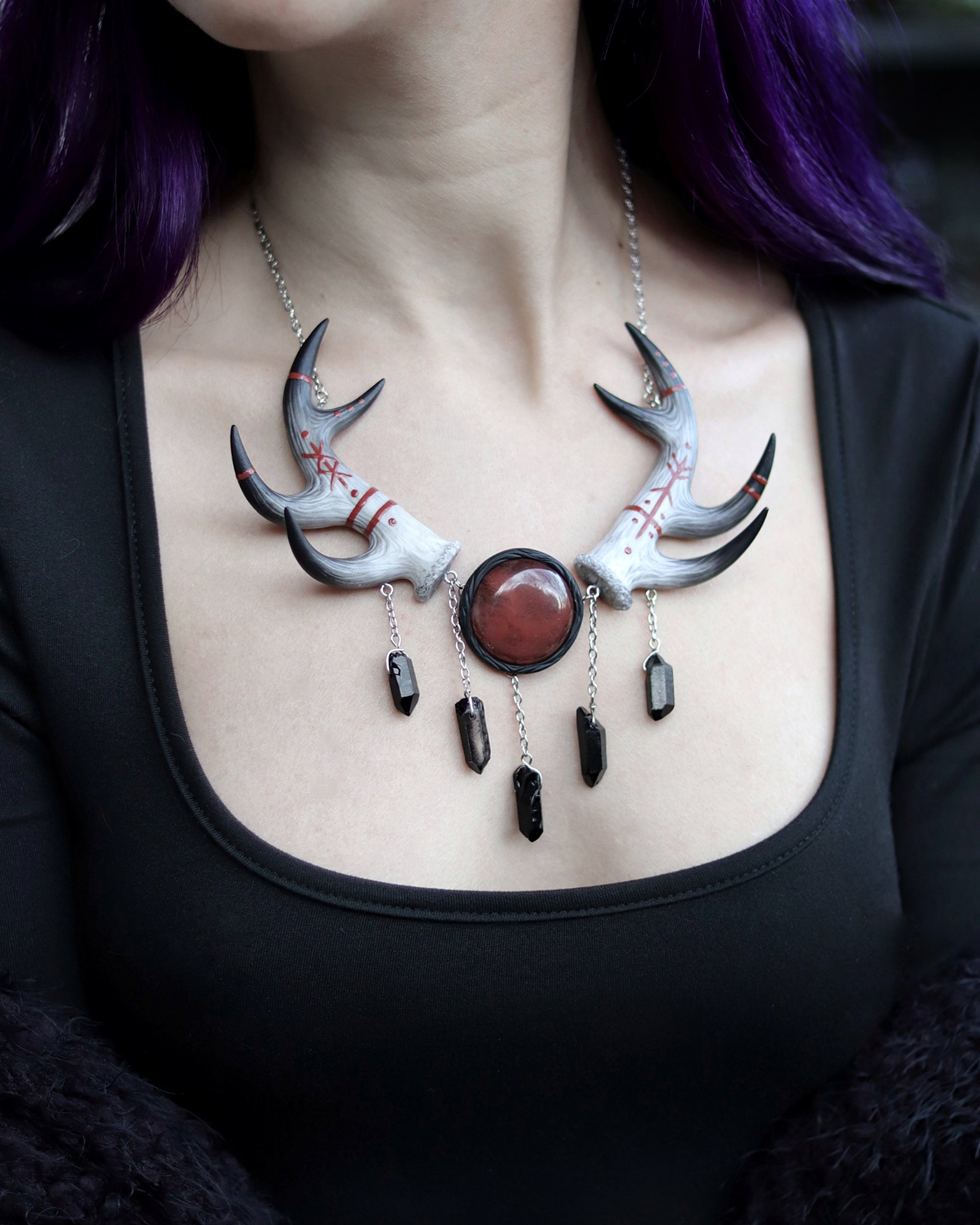 This large statement necklace consists of a pair of deer antlers handsculpted out of polymer clay and decorated with rune paintings, a "cherry quartz" (glass) cabochon and five black dyed quartz points hanging on chains.