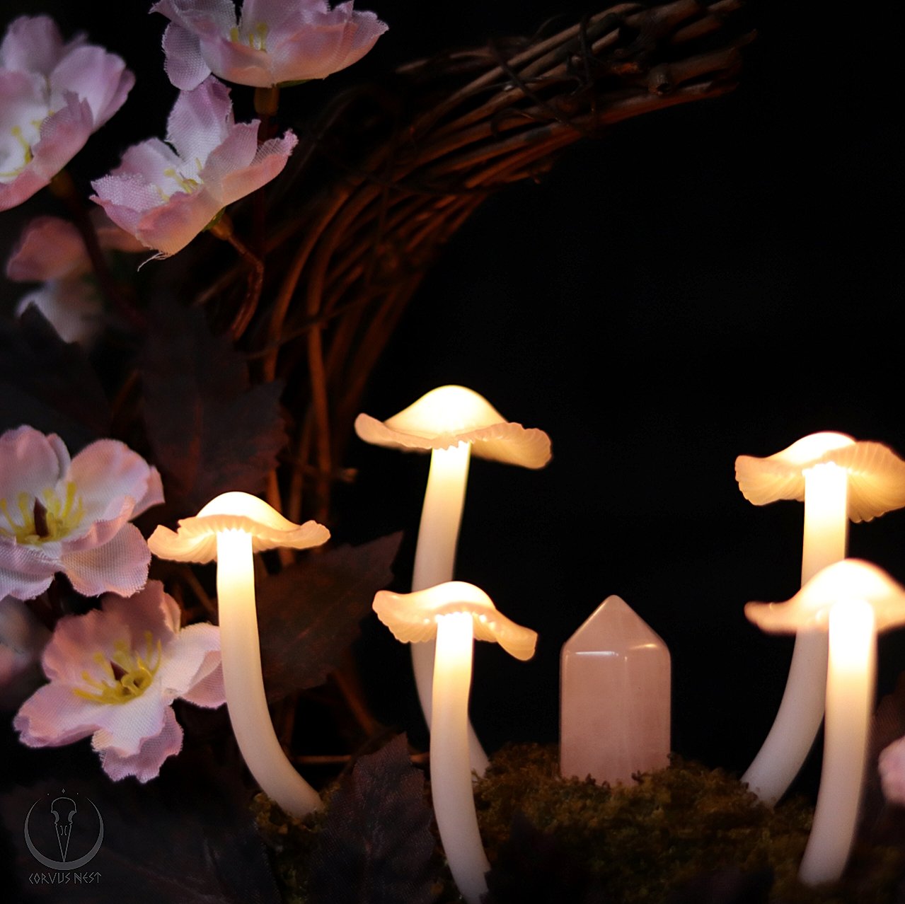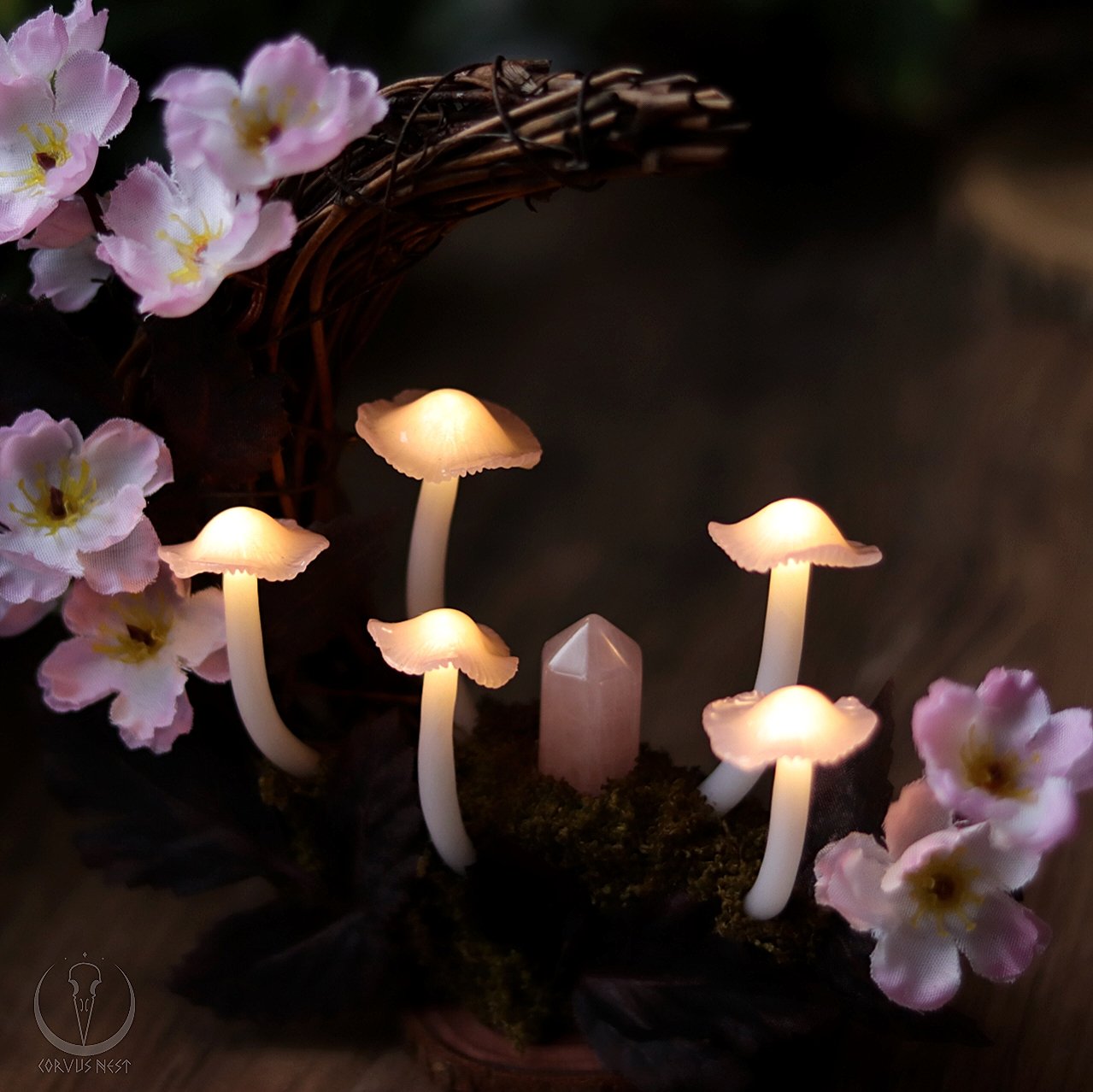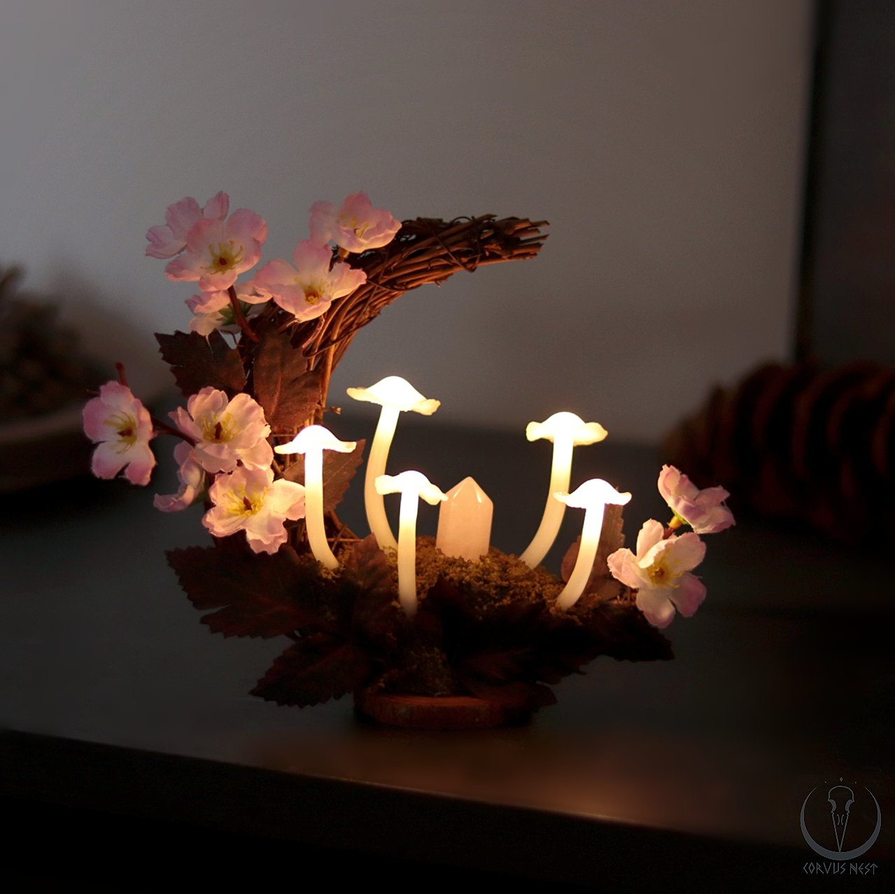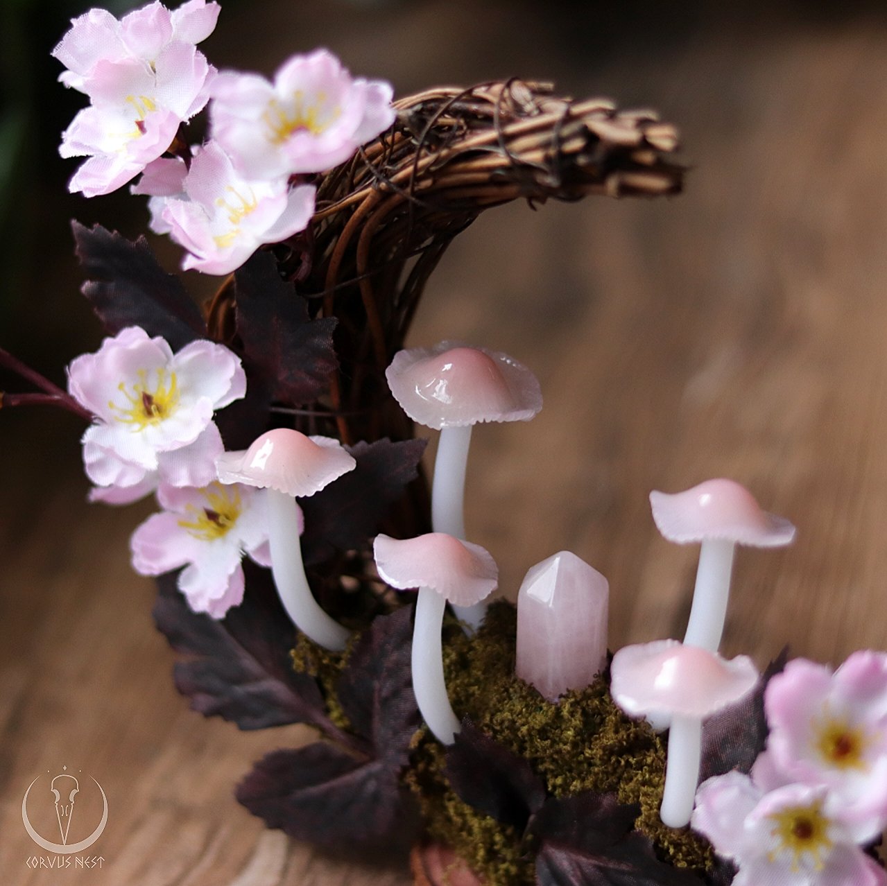 Each mushroom is handsculpted out of polymer clay, with a led light placed inside, sitting on a moon shaped twig wreath along with a carved rose quartz point, and decorated with artificial cherry blossom flowers and leaves.