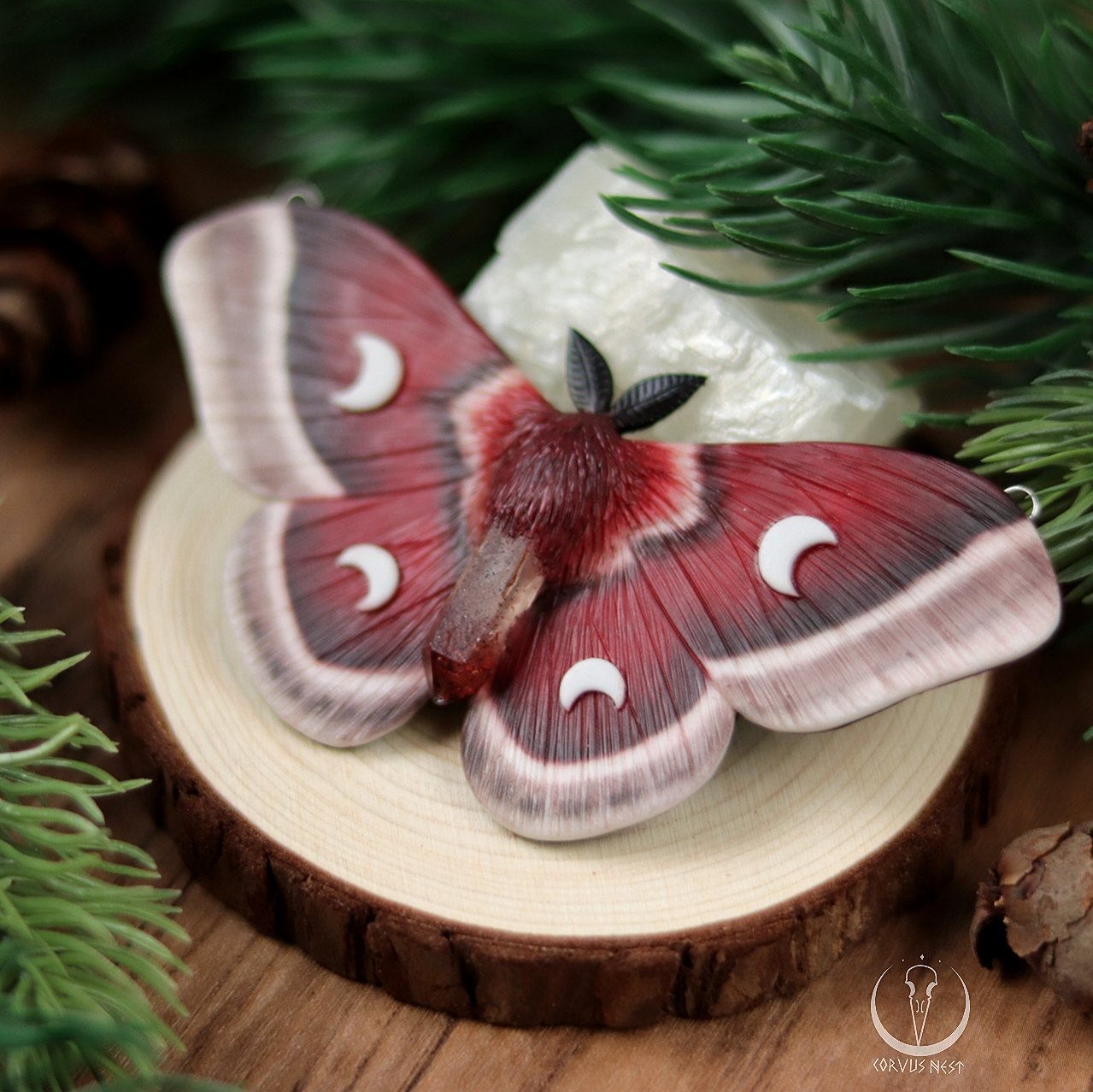 Handsculpted and painted necklace inspired by hyalophora cecropia moths, made out of polymer clay and harlequin quartz point in its middle.