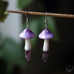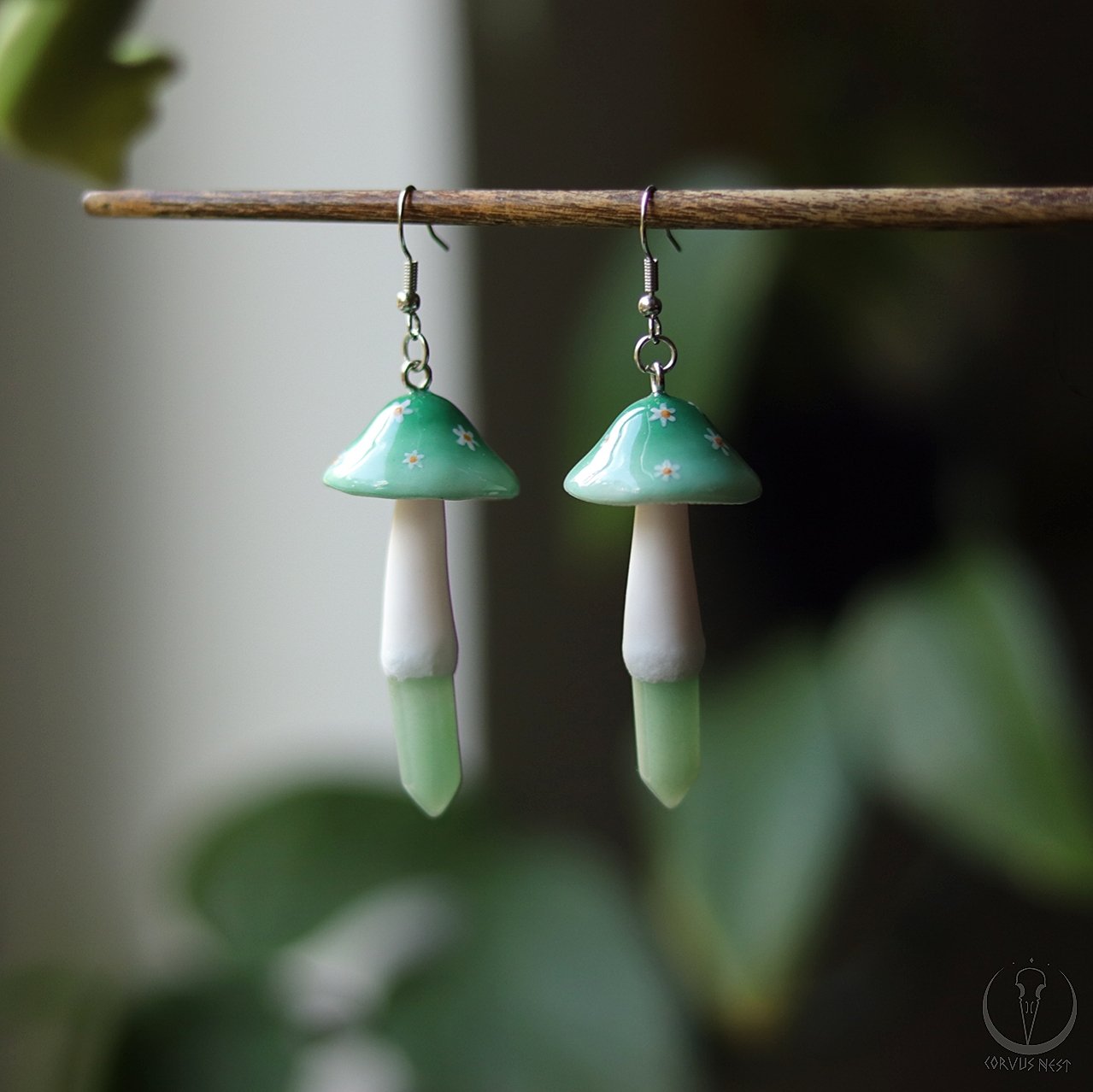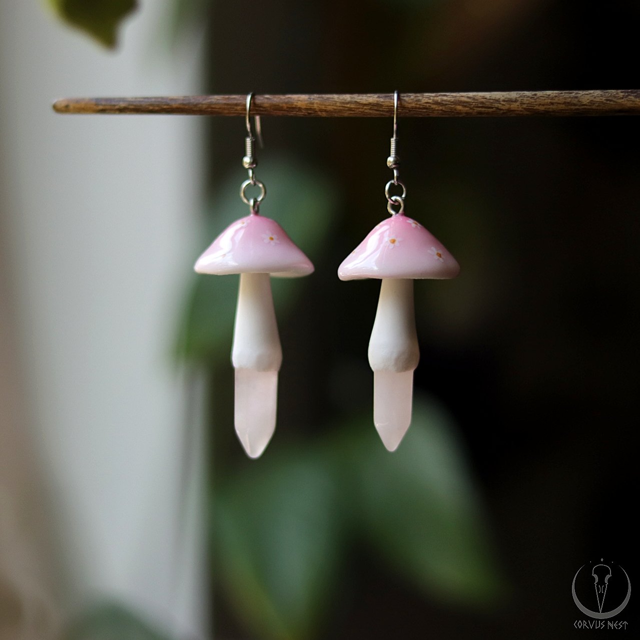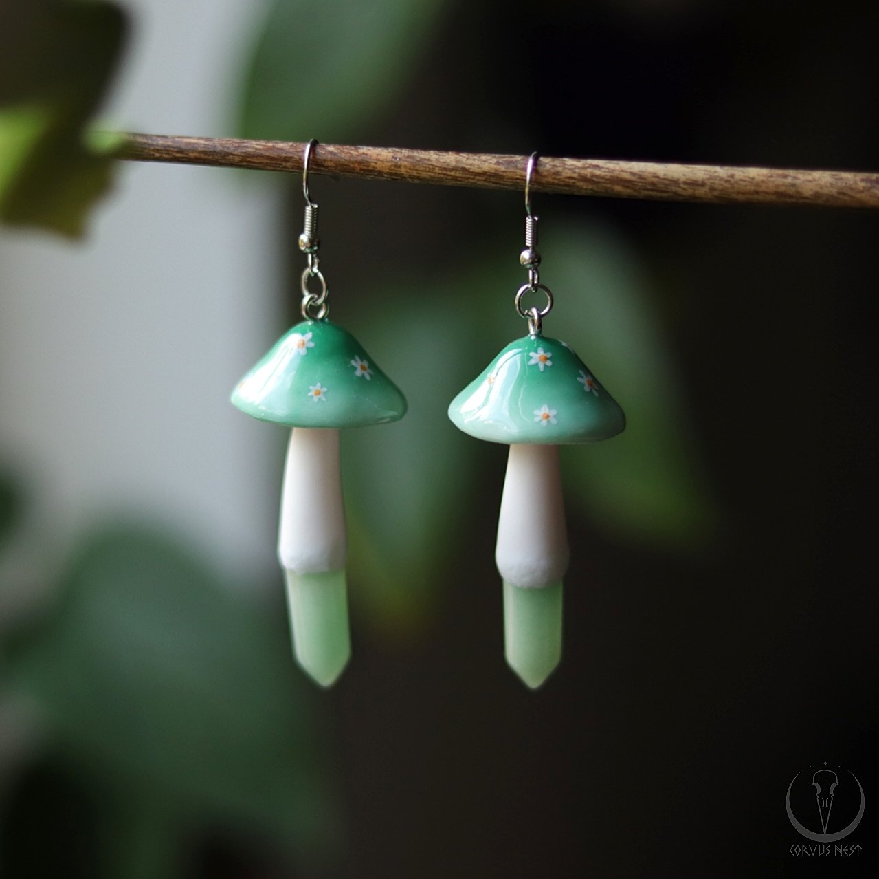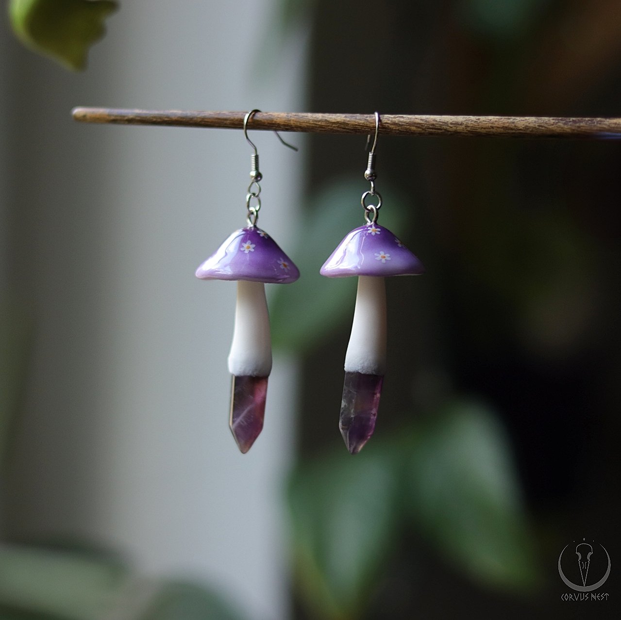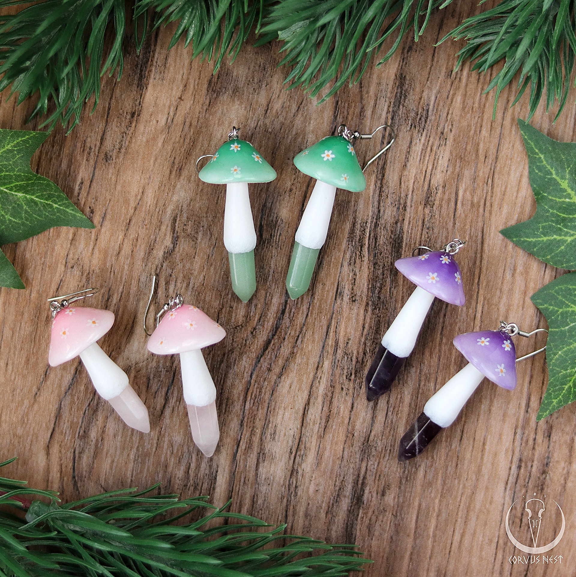 Handsculpted polymer clay mushroom pendant with amethyst/rose quartz/aventurine point in their stem, tiny flowers painted on their caps and sealed with a glossy varnish.