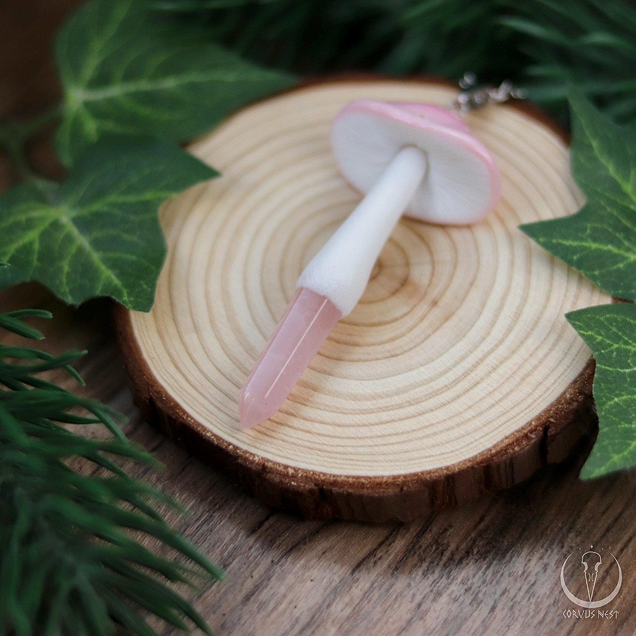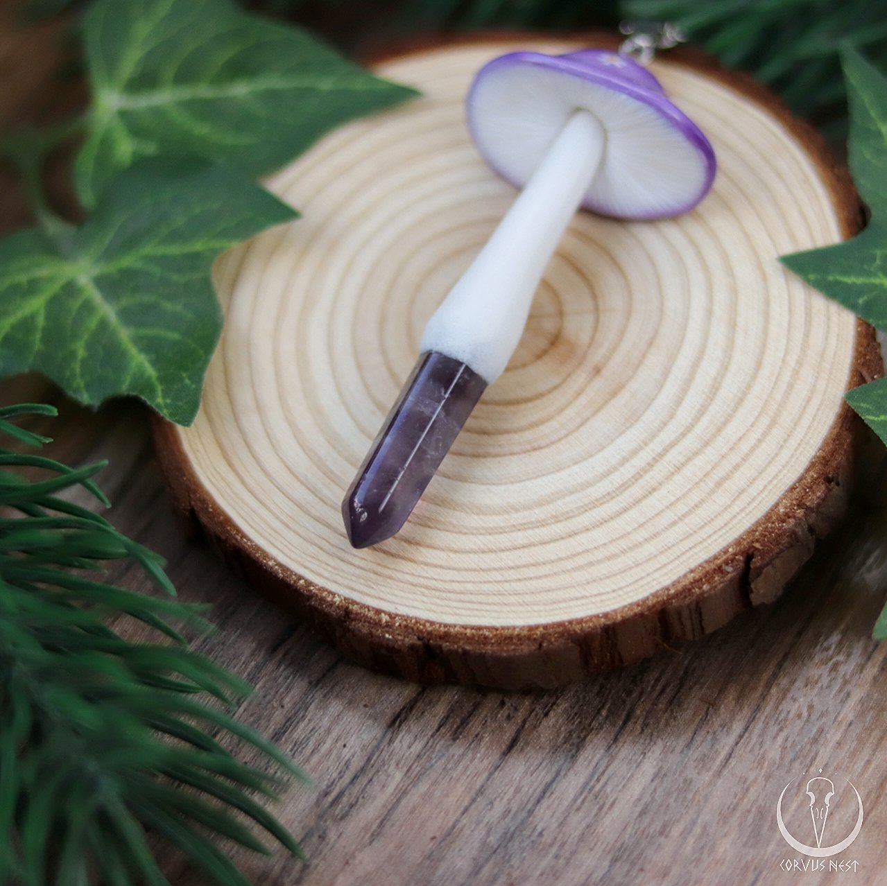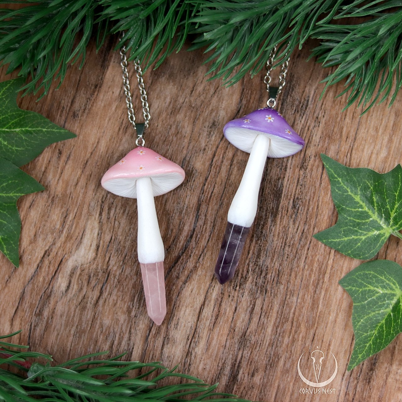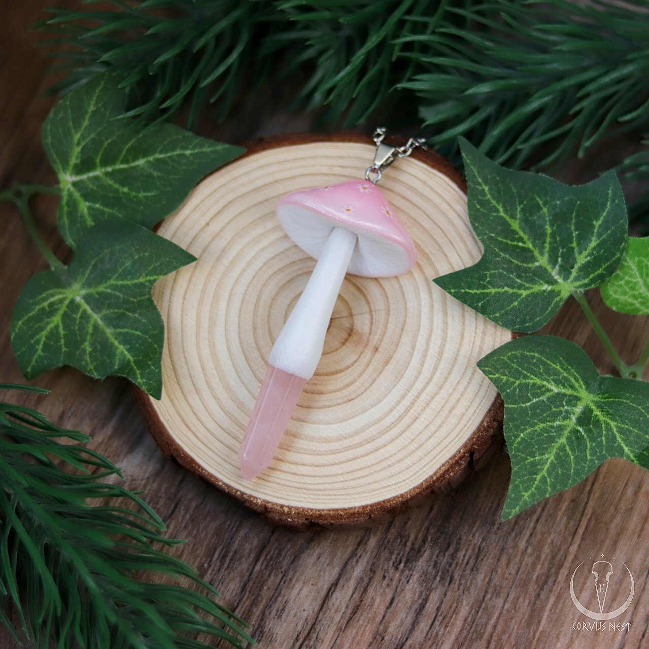 Handsculpted polymer clay mushroom pendant with amethyst/rose quartz point in their stem, tiny flowers painted on their caps and sealed with a glossy varnish.