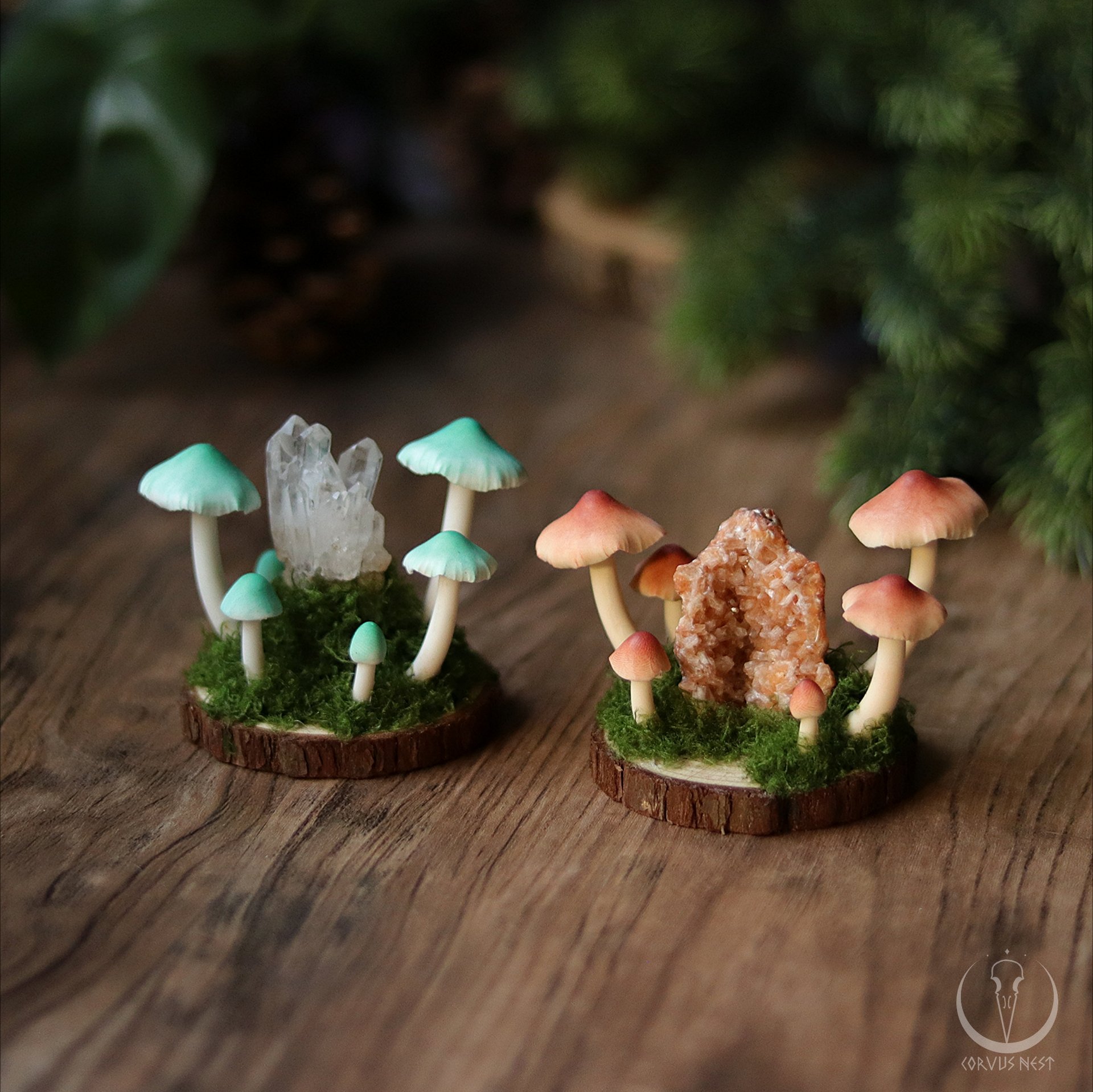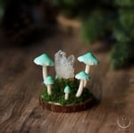 This little decoration piece consists of a raw crystal surrounded by mushrooms handsculpted out of polymer clay, decorated with faux moss, based on a wood slice.