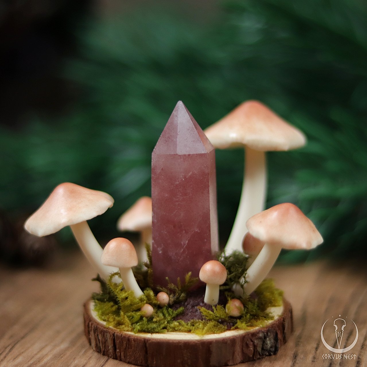 This little decoration piece consists of a carved strawberry quartz point surrounded by mushrooms handsculpted out of polymer clay, decorated with real moss, based on a wood slice.