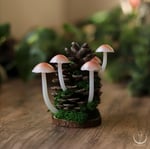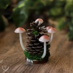 Each mushroom is handsculpted out of polymer clay, with a led inside, growing out of a real pine cone, based on a wood slice, decorated with moss.