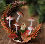 Each mushroom is handsculpted out of polymer clay, with a led inside, placed on a moon shaped twig wreath, with a raw citrine point (heated amethyst) sitting in it, surrounded by artificial leaves,moss and alder cones. The wreath standing based on a wood slice.