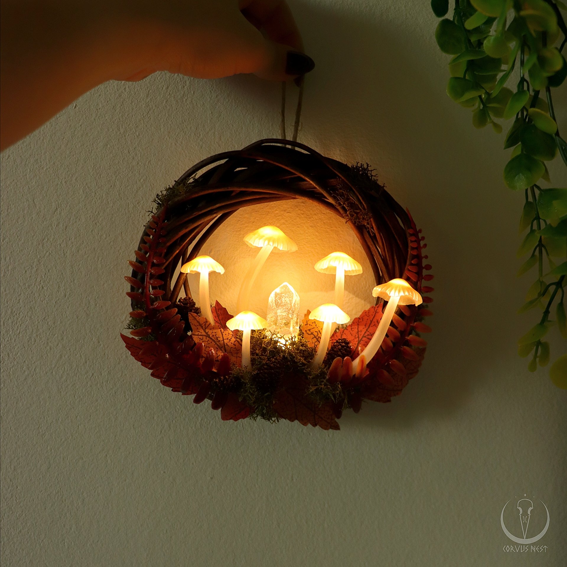 This hand crafted mushroom light wreath will bring the magic of an enchanted forest to your home!