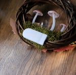 Each mushroom is handsculpted out of polymer clay, with a led inside, placed on a twig wreath, with a raw rock crystal point sitting in it, surrounded by artificial plant leaves, real moss and alder cones. The wreath is hanging on a hemp rope.