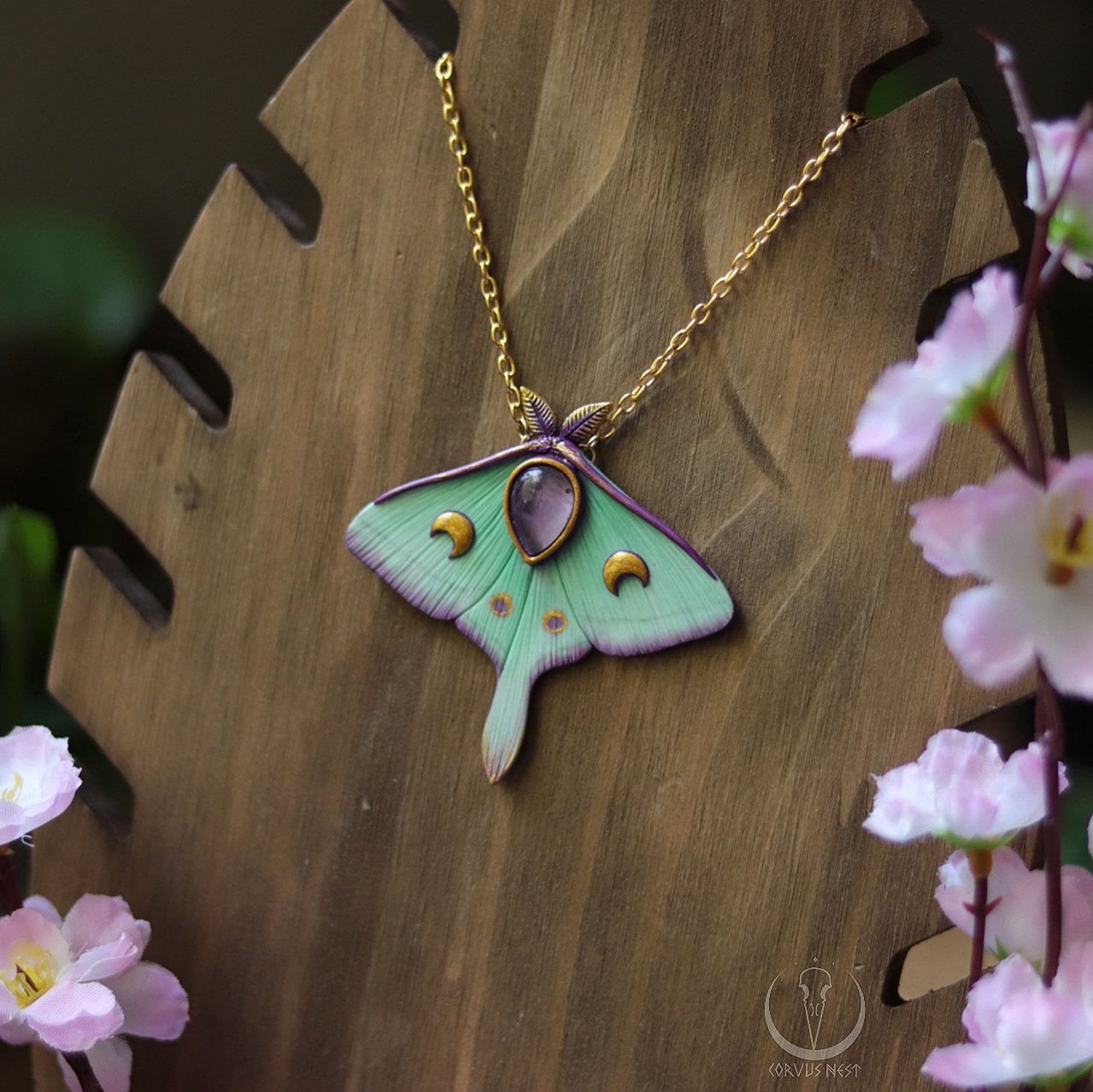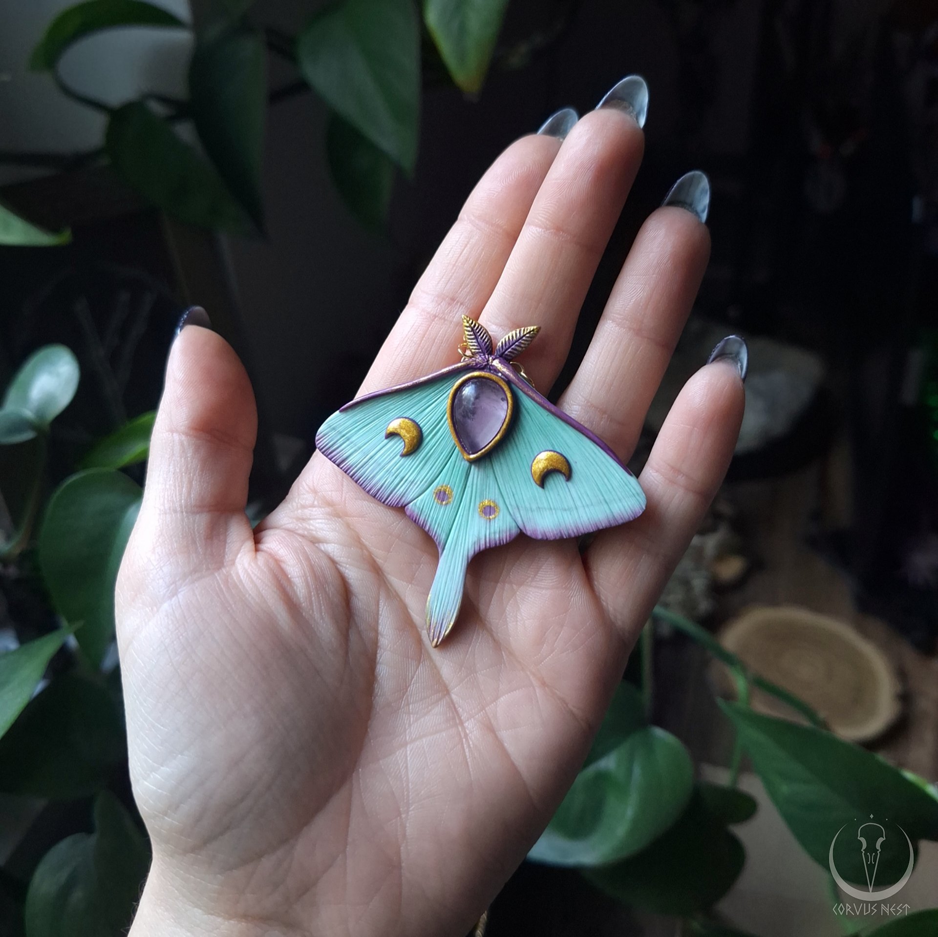 Magical luna moth pendant handsculpted out of polymer clay, with an amethyst cabochon in the middle, and decorated with golden crescent moons.