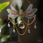 This majestic large suncatcher consists of a triple pair of holographic bee wings handmade out of resin, connected with a golden flower ornament in the middle, a large soft yellow glass prism pendant, four metal hexagons, and five small glass beads, hanging on golden plated chain with a hook on its end.