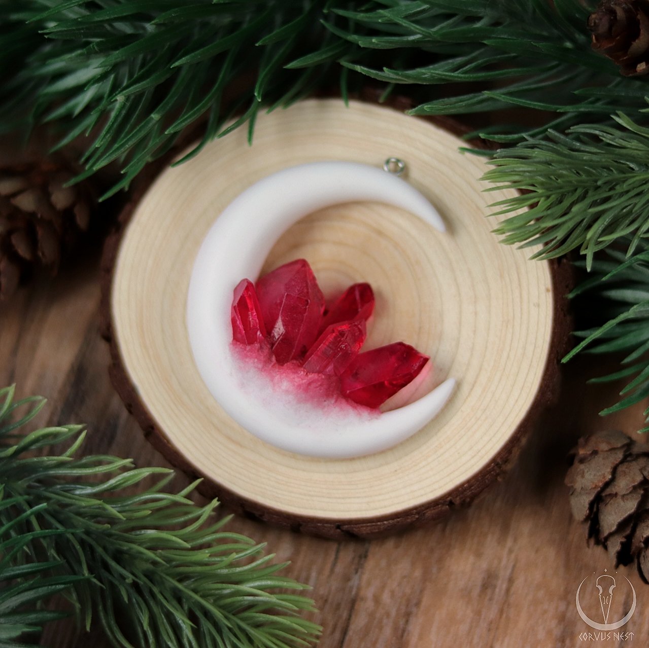 White crescent moon handsculpted out of polymer clay with five red dyed quartz point sitting in it.